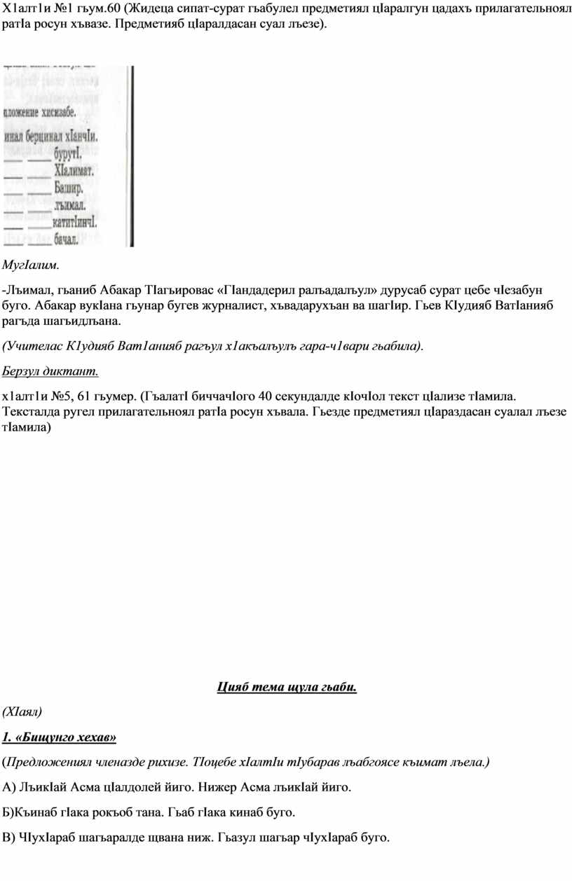 Х1алт1и №1 гьум.60 (Жидеца сипат-сурат гьабулел предметиял цIаралгун цадахъ прилагательноял ратIа росун хъвазе. Предметияб цIаралдасан суал лъезе).