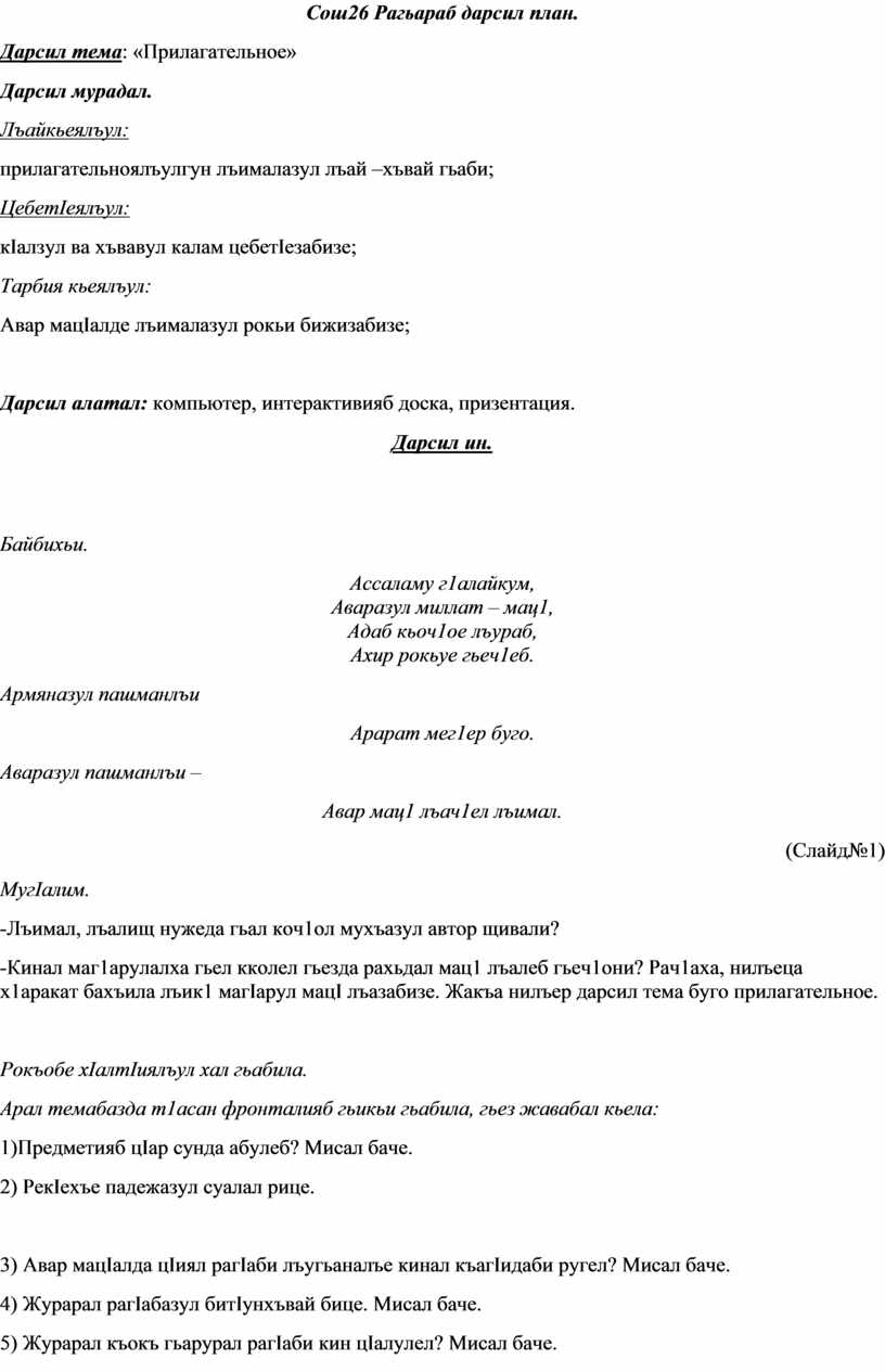 -Кинал маг1арулалха гьел кколел гьезда рахьдал мац1 лъалеб гьеч1они? Рач1аха, нилъеца х1аракат бахъила лъик1 магIарул мацI лъазабизе. Жакъа нилъер дарсил тема буго прилагательное.