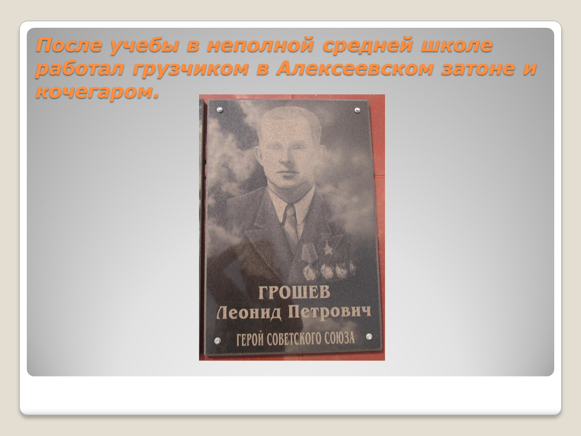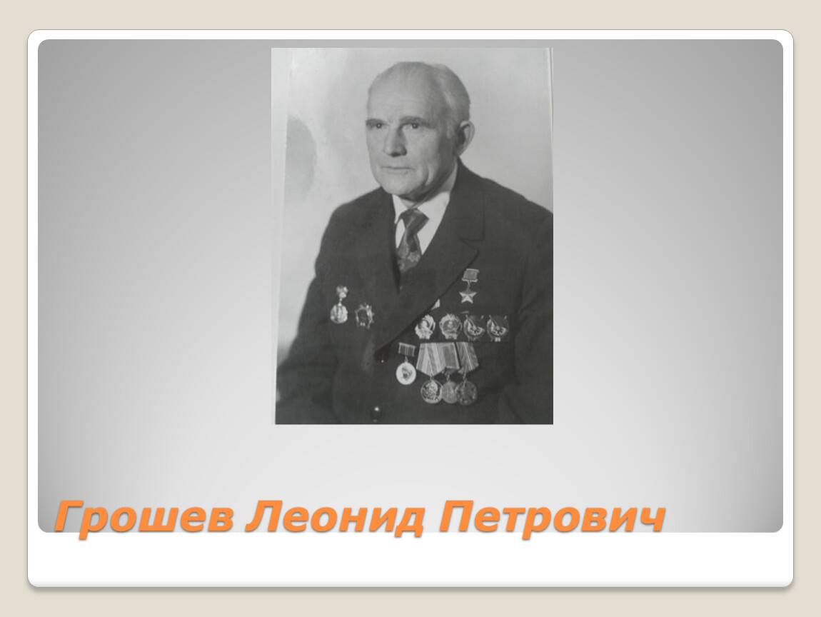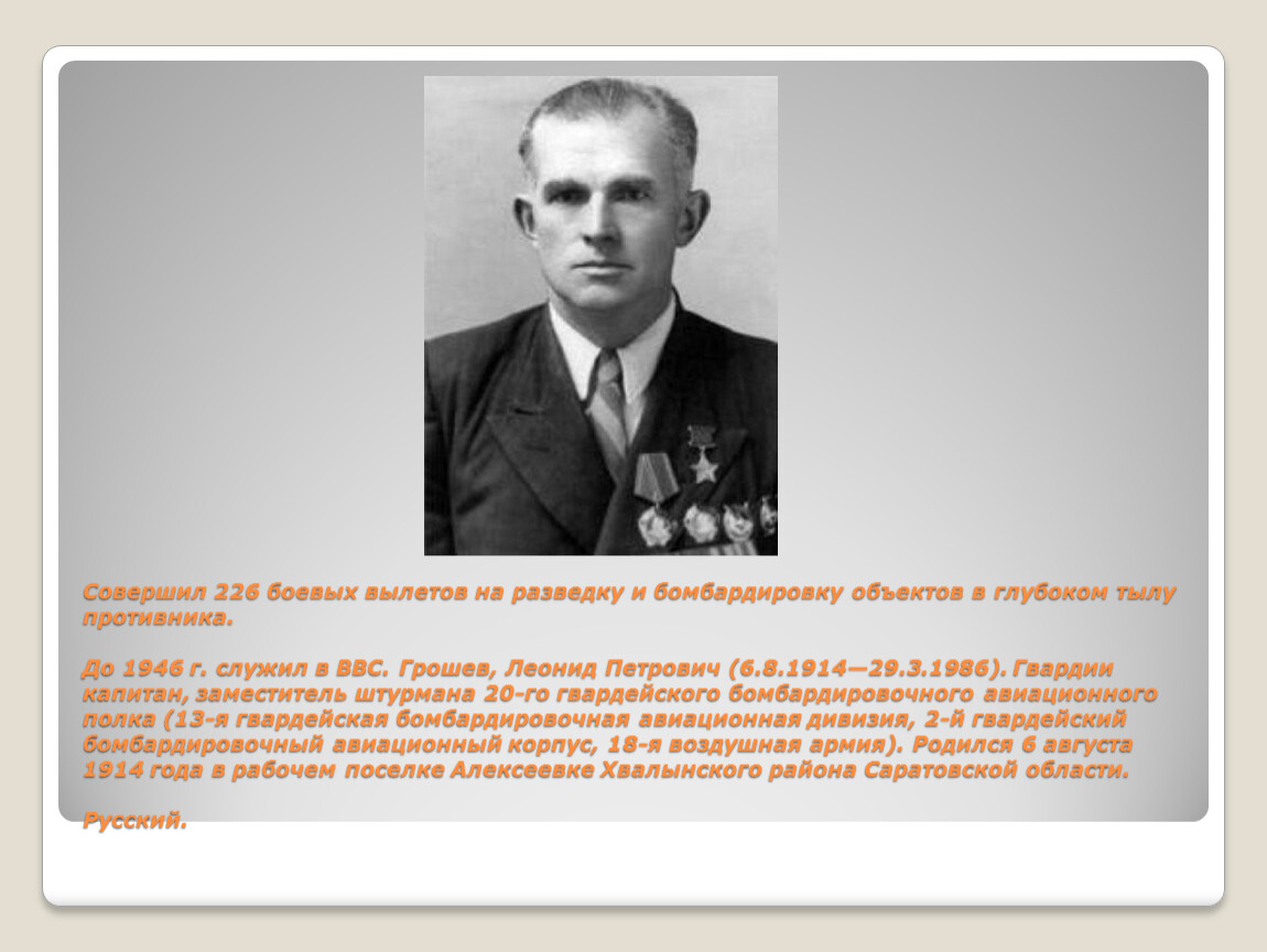 Совершил 226 боевых вылетов на разведку и бомбардировку объектов в глубоком тылу противника. До 1946 г. служил в ВВС. Грошев, Леонид Петрович (6.8.1914—29.3.1986). Гвардии капитан, заместитель штурмана 20-го гвардейского бомбардировочного авиационного полка (13-я гвардейская бомбардировочная авиационная дивизия, 2-й гвардейский бомбардировочный авиационный корпус, 18-я воздушная армия). Родился 6 августа 1914 года в рабочем поселке Алексеевке Хвалынского района Саратовской области. Русский.