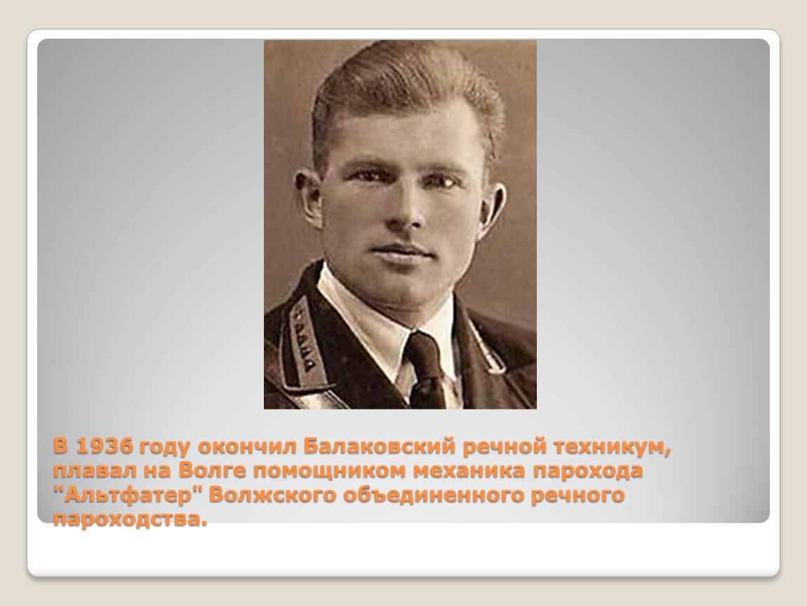 В 1936 году окончил Балаковский речной техникум, плавал на Волге помощником механика парохода "Альтфатер" Волжского объединенного речного пароходства.