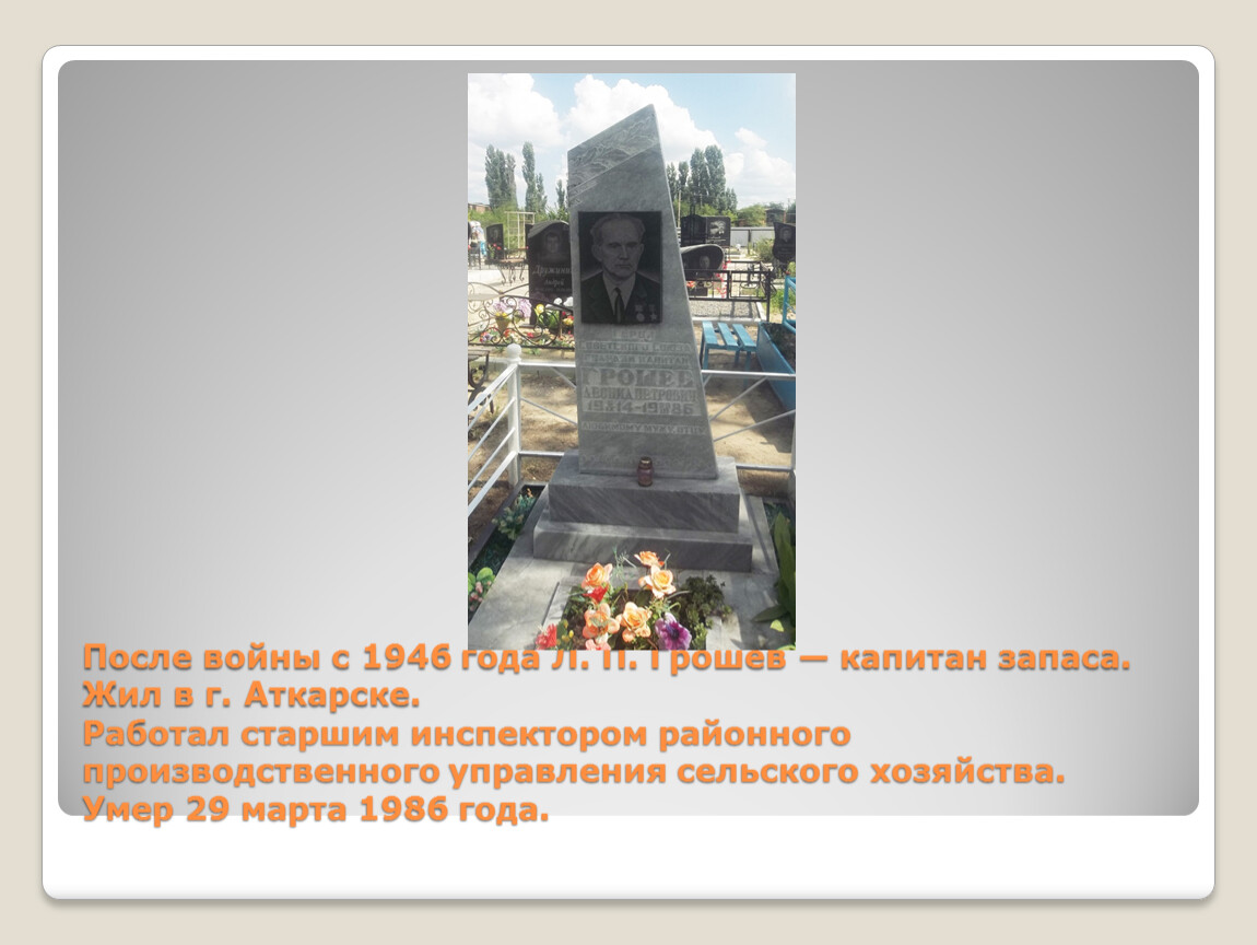 После войны с 1946 года Л. П. Грошев — капитан запаса. Жил в г. Аткарске. Работал старшим инспектором районного производственного управления сельского хозяйства. Умер 29 марта 1986 года.