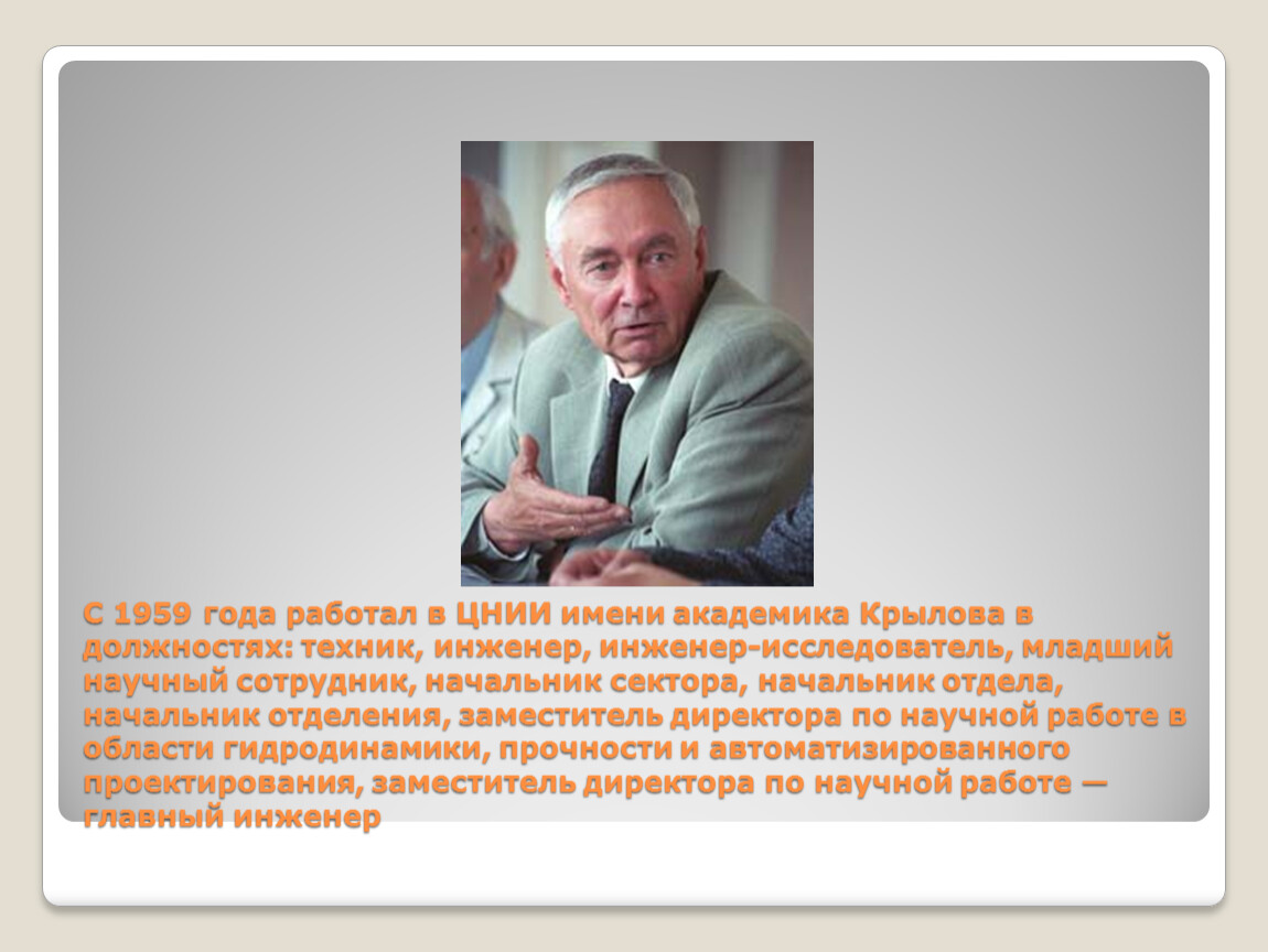 С 1959 года работал в ЦНИИ имени академика Крылова в должностях: техник, инженер, инженер-исследователь, младший научный сотрудник, начальник сектора, начальник отдела, начальник отделения, заместитель директора по научной работе в области гидродинамики, прочности и автоматизированного проектирования, заместитель директора по научной работе — главный инженер