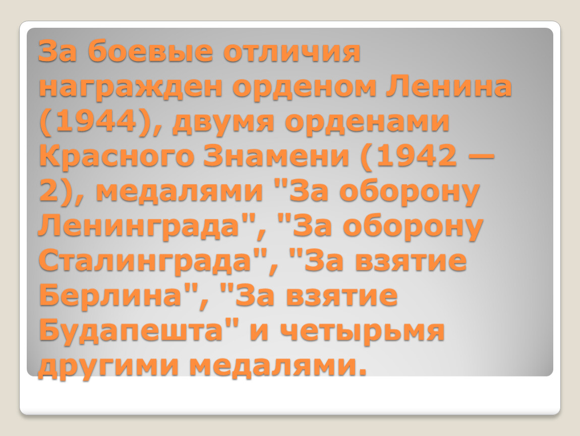 За боевые отличия награжден орденом Ленина (1944), двумя орденами Красного Знамени (1942 — 2), медалями "За оборону Ленинграда", "За оборону Сталинграда", "За взятие Берлина", "За взятие Будапешта" и четырьмя другими медалями.