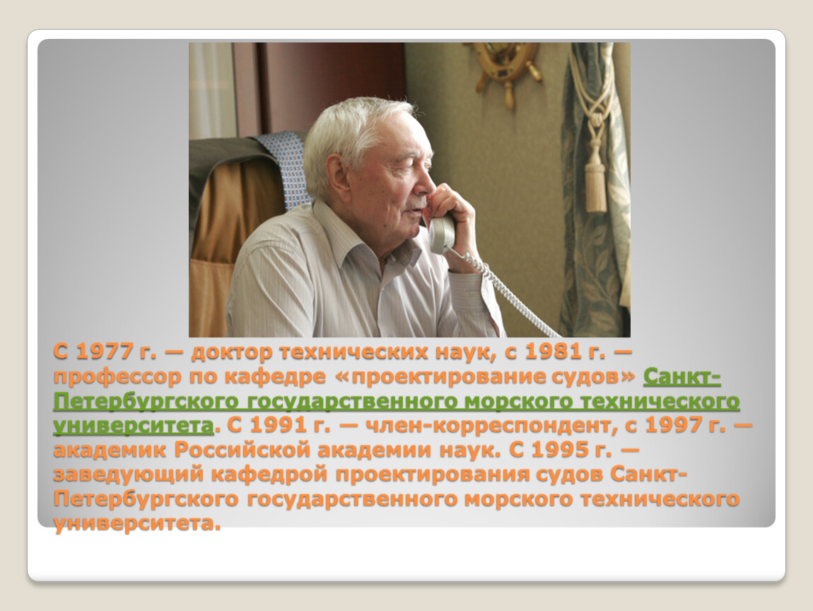 С 1977 г. — доктор технических наук, с 1981 г. — профессор по кафедре «проектирование судов» Санкт-Петербургского государственного морского технического университета. С 1991 г. — член-корреспондент, с 1997 г. — академик Российской академии наук. С 1995 г. — заведующий кафедрой проектирования судов Санкт-Петербургского государственного морского технического университета.