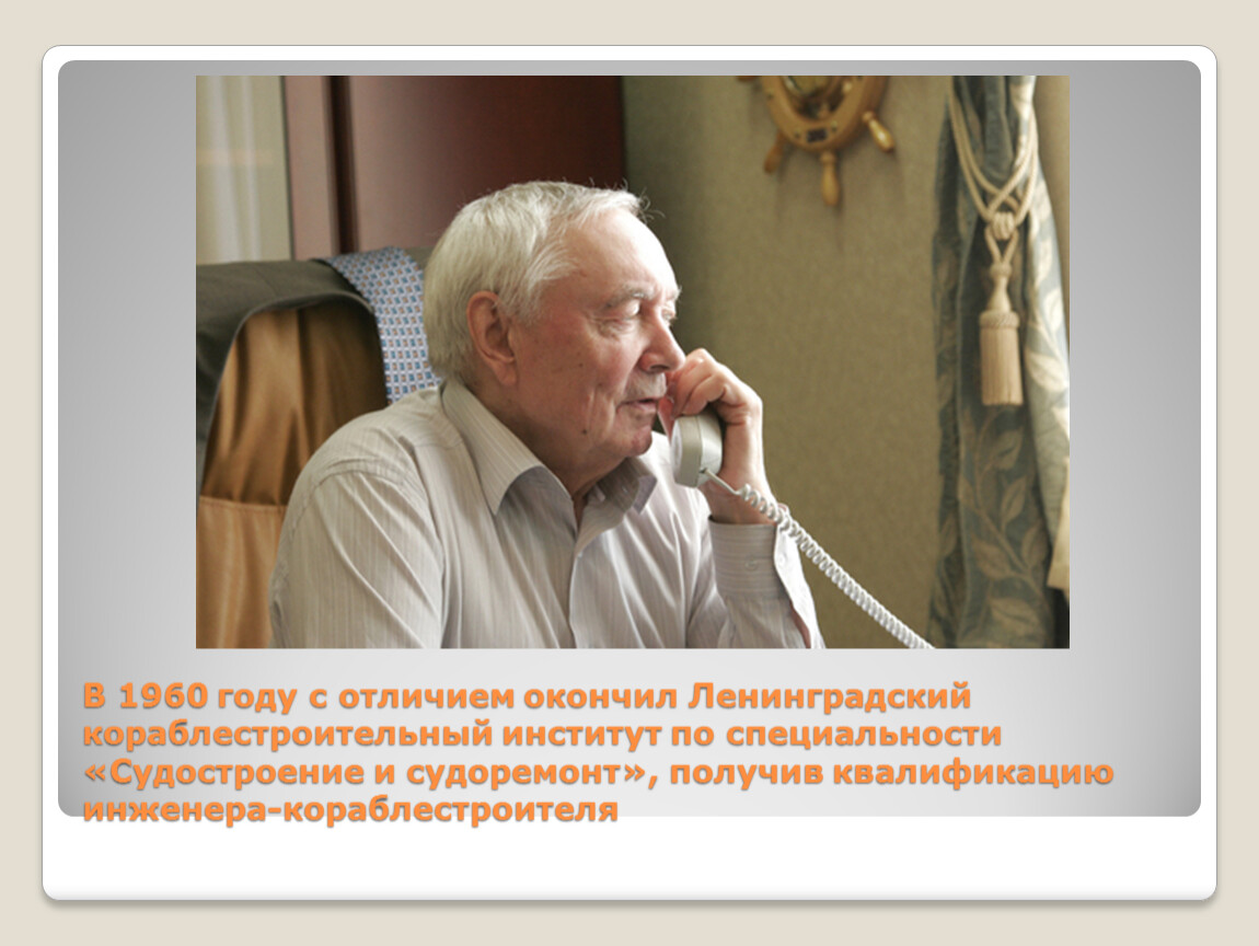 В 1960 году с отличием окончил Ленинградский кораблестроительный институт по специальности «Судостроение и судоремонт», получив квалификацию инженера-кораблестроителя