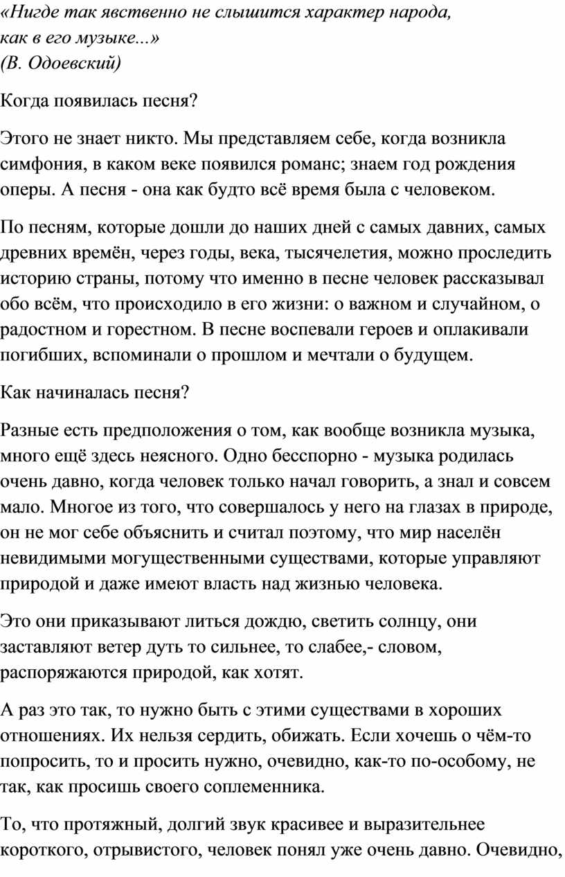 То, что протяжный, долгий звук красивее и выразительнее короткого, отрывистого, человек понял уже очень давно. Очевидно, моля, заклиная о чём-то невидимых духов, он пробовал тянуть звук, старался делать свой голос певучим. Может быть, так всё это было, может быть, иначе, однако самые древние песни, которые мы знаем,- это именно такие вот заклинания духов. Их даже трудно назвать песнями; мелодии их ещё очень просты и примитивны, но всё-таки это уже были первые песни.