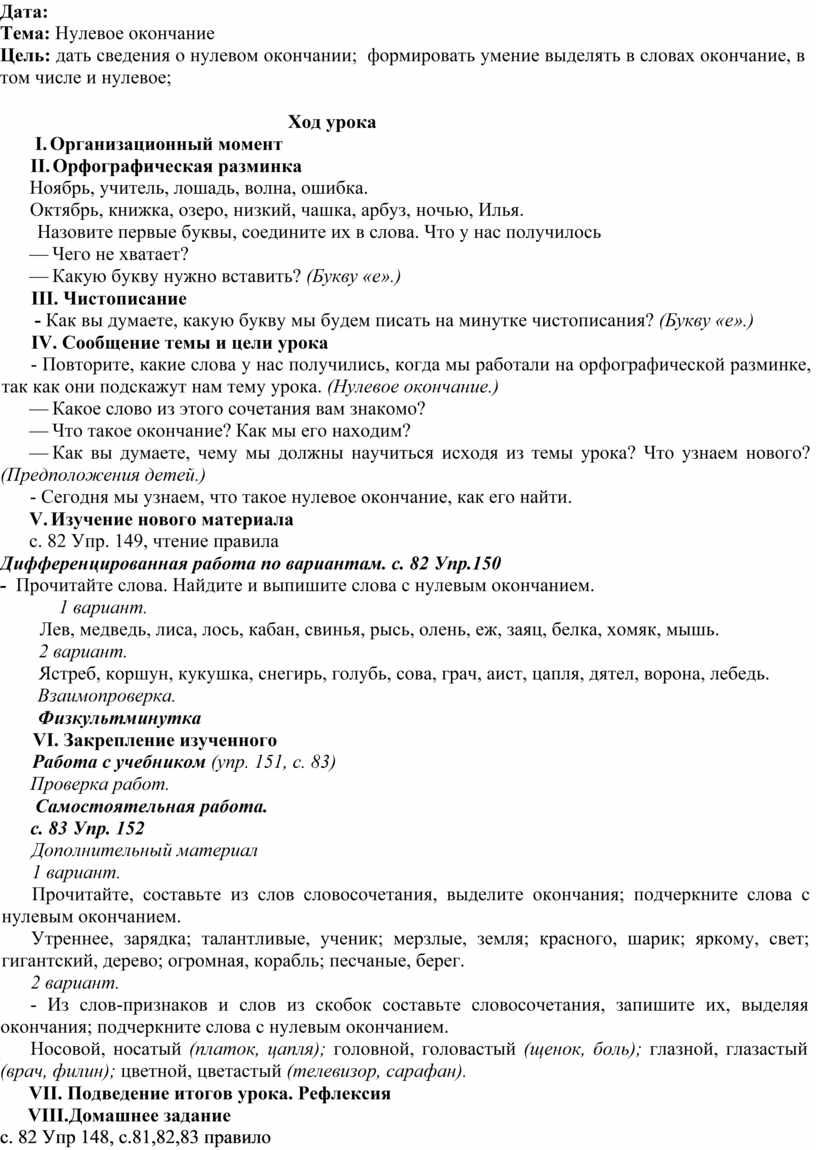 Цель: дать сведения о нулевом окончании; формировать умение выделять в словах окончание, в том числе и нулевое;