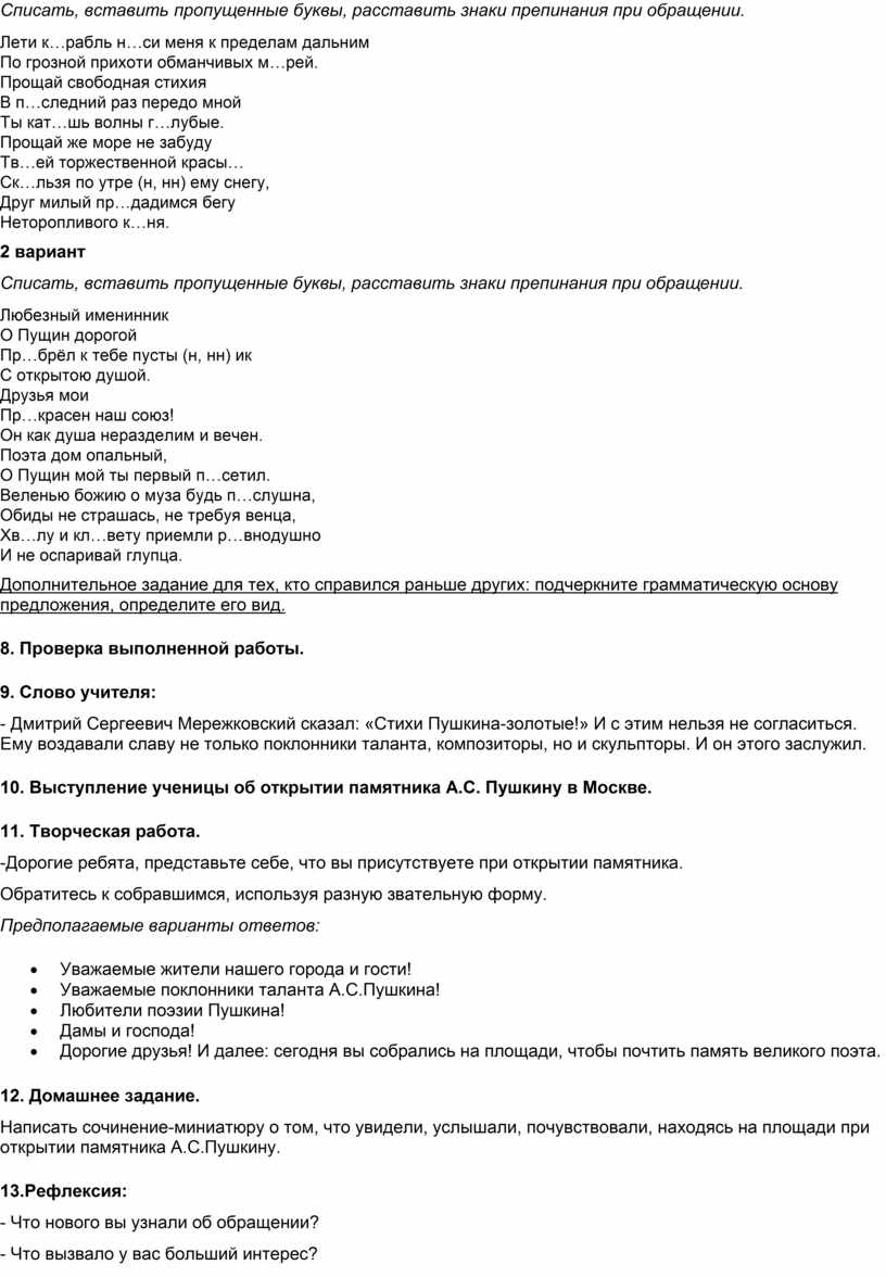 Урок русского языка в 8-м классе по теме "Обращение, знаки препинания при нем"