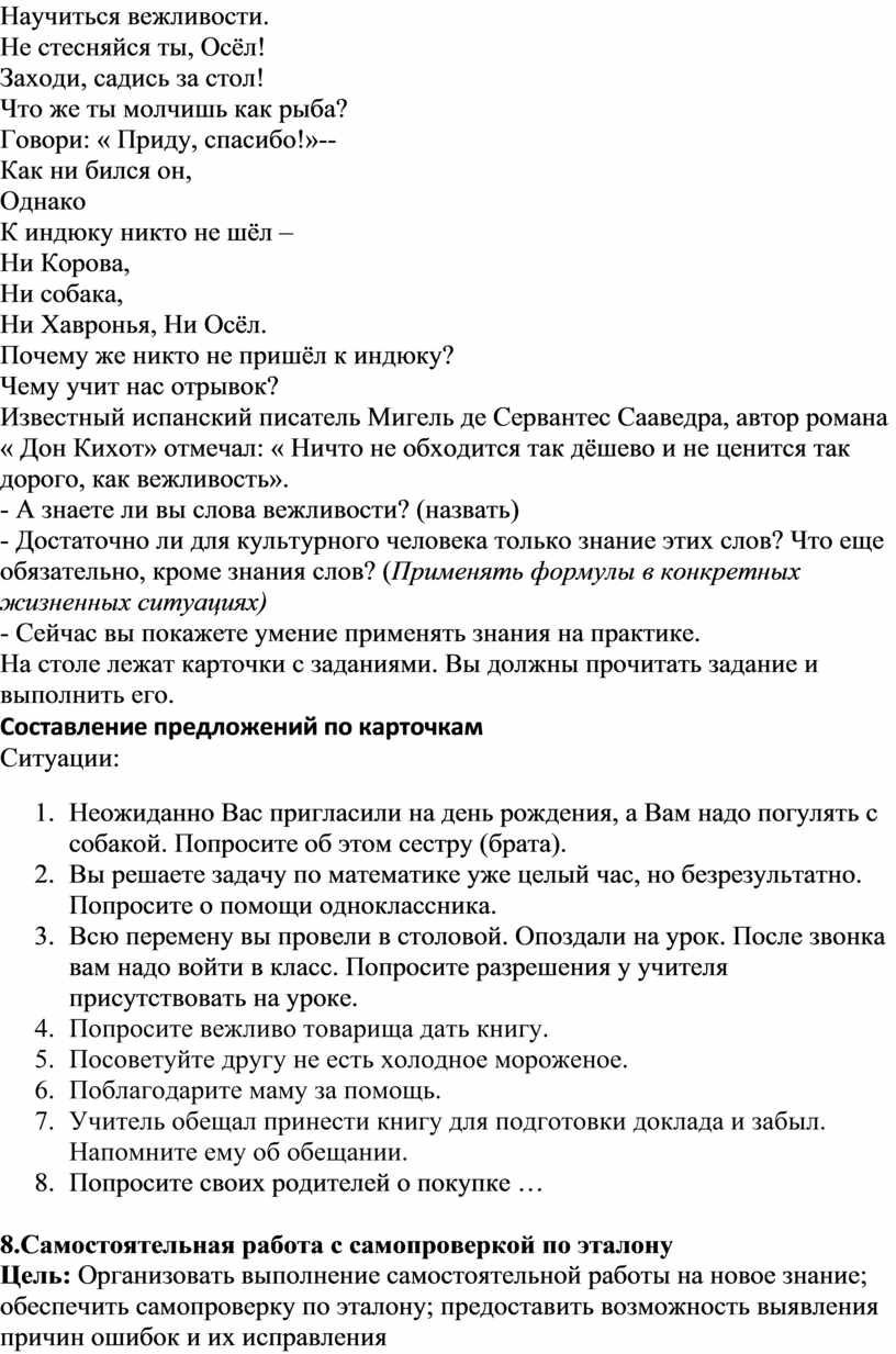 3. Всю перемену вы провели в столовой. Опоздали на урок. После звонка вам надо войти в класс. Попросите разрешения у учителя присутствовать на уроке.