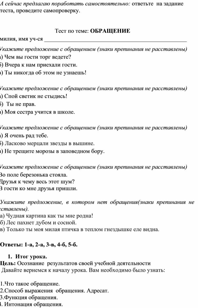 Тест по теме: ОБРАЩЕНИЕ