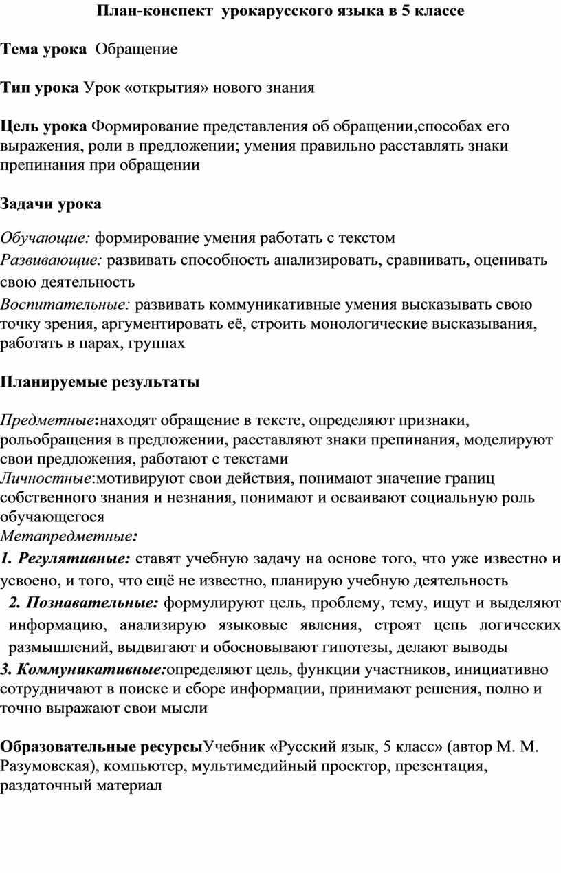 План-конспект урокарусского языка в 5 классе
