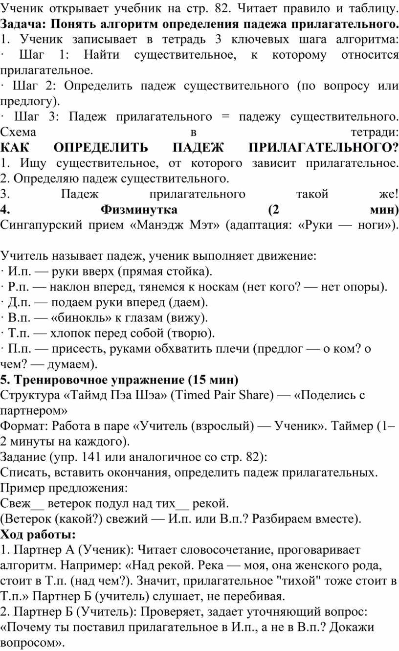 1. Партнер А (Ученик): Читает словосочетание, проговаривает алгоритм. Например: