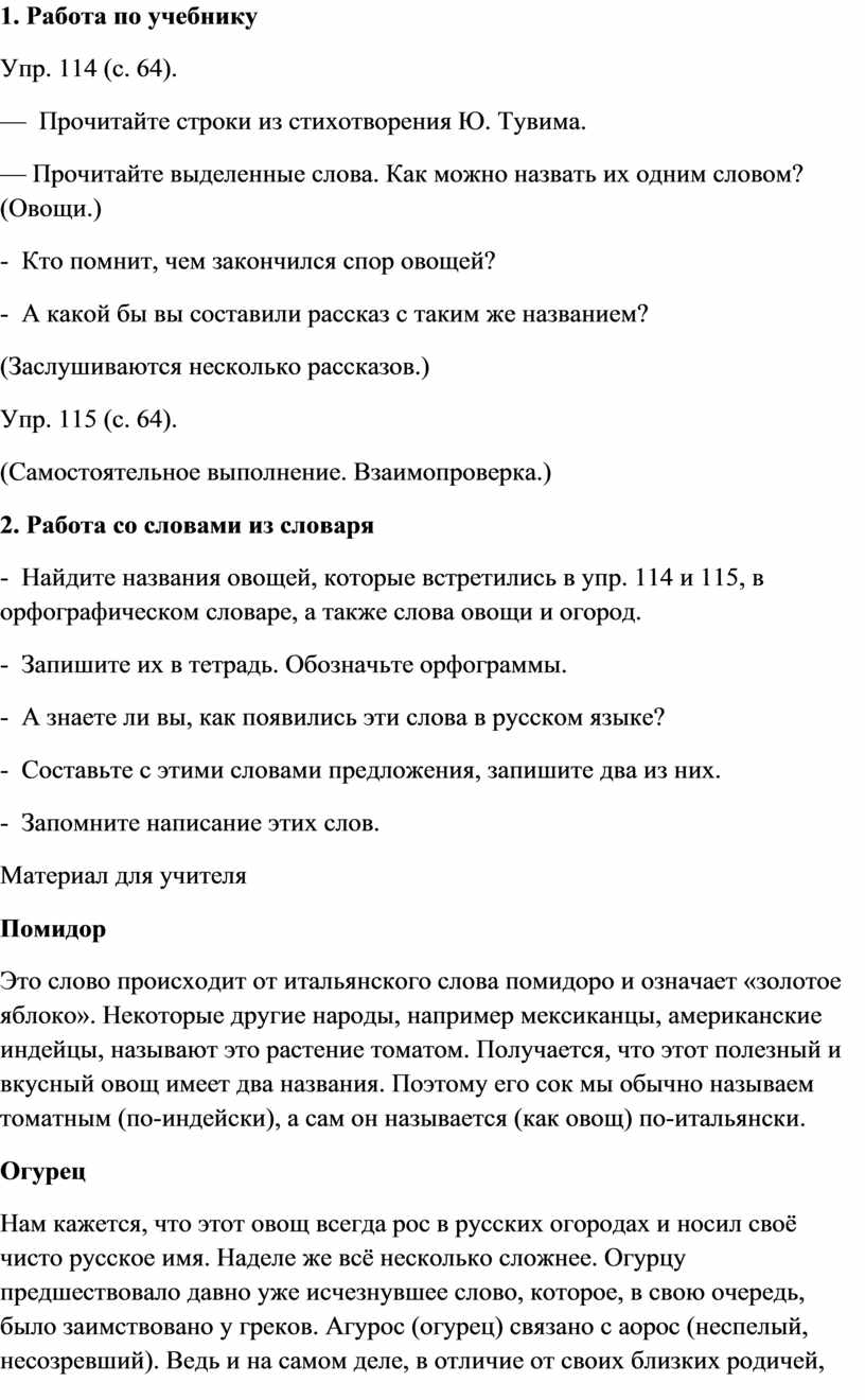 - Найдите названия овощей, которые встретились в упр. 114 и 115, в орфографическом словаре, а также слова овощи и огород.