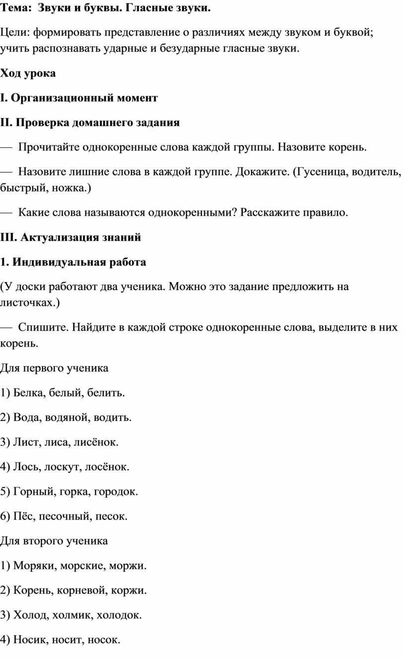 Цели: формировать представление о различиях между звуком и буквой; учить распознавать ударные и безударные гласные звуки.