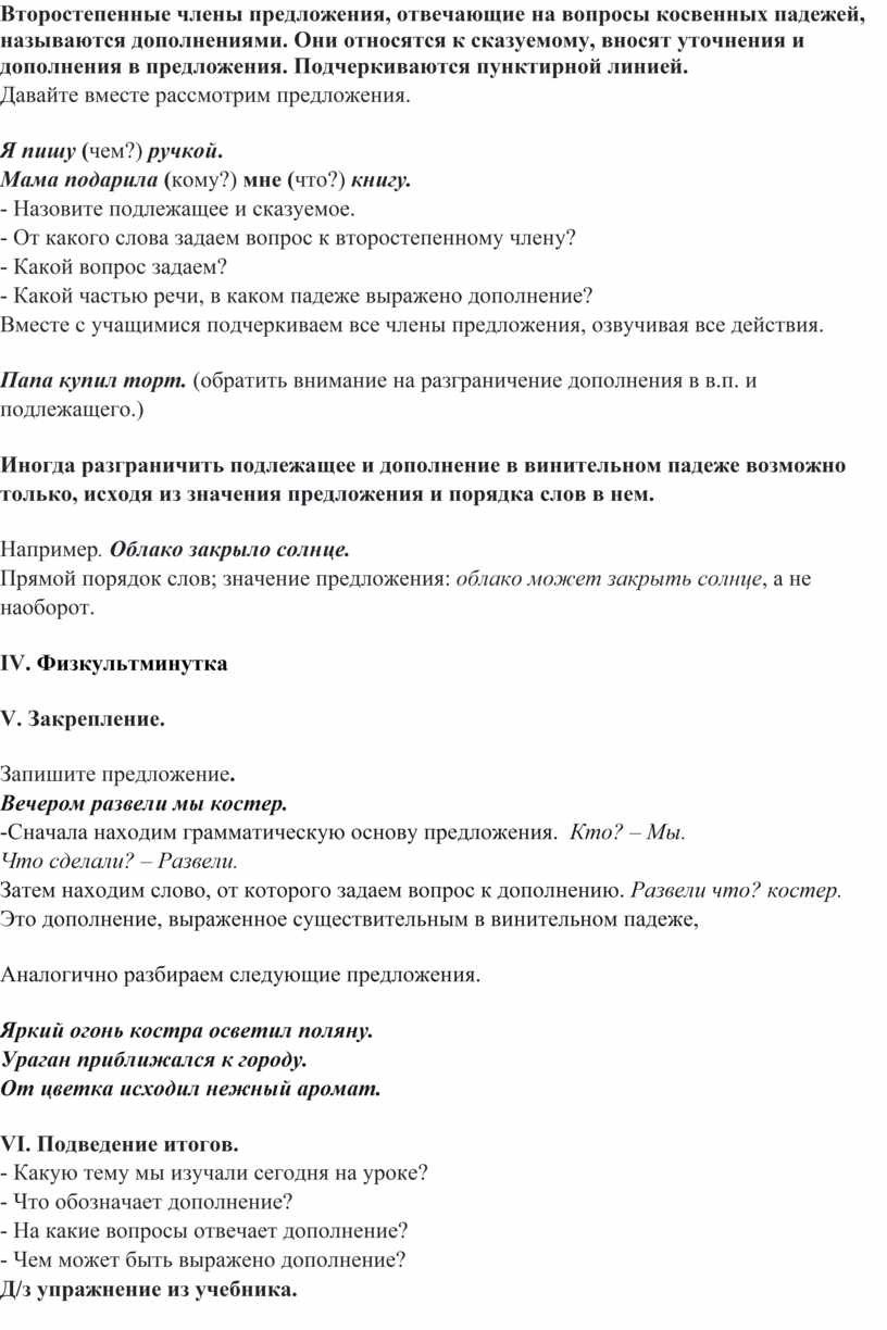 III. Объяснение нового материала. Сегодня на уроке мы с вами познакомимся с второстепенным членом предложения - дополнением, выясним, какими частями речи оно может быть выражено. Подготовка к восприятию нового материала (наблюдение над предложением).