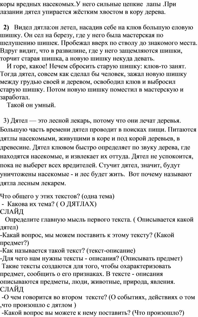 - Что содержит третий текст? Что происходит в третьем тексте? (доказательство, доказывается, что дятел является лесным лекарем)