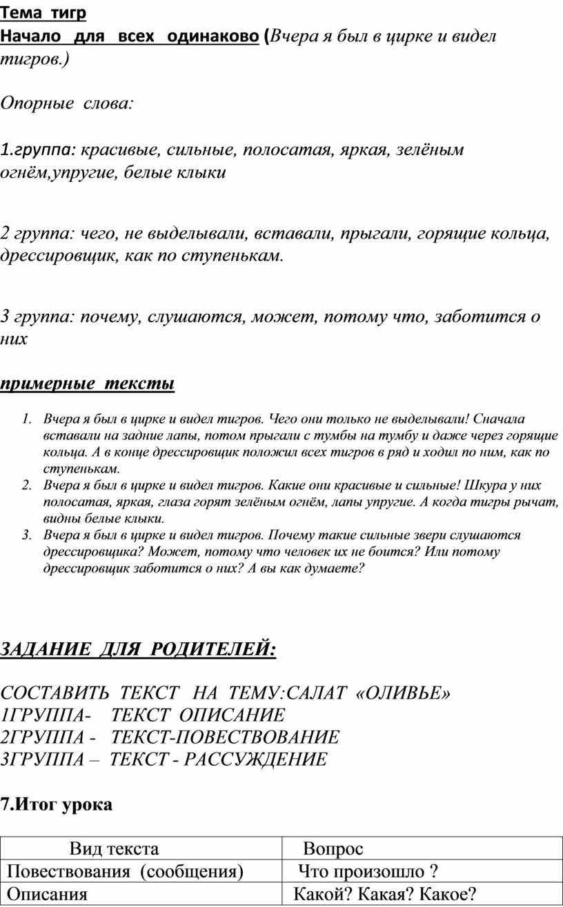 2. Вчера я был в цирке и видел тигров. Какие они красивые и сильные! Шкура у них полосатая, яркая, глаза горят зелёным огнём, лапы упругие. А когда тигры рычат, видны белые клыки.