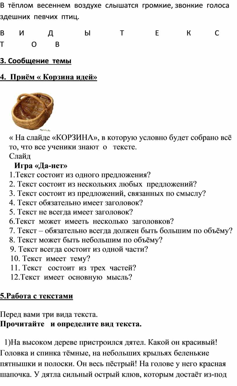 « На слайде «КОРЗИНА», в которую условно будет собрано всё то, что все ученики знают о тексте.