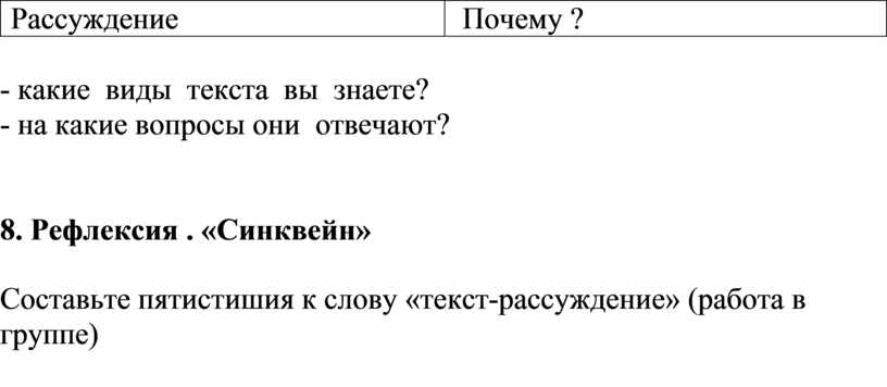 Составьте пятистишия к слову «текст-рассуждение» (работа в группе)