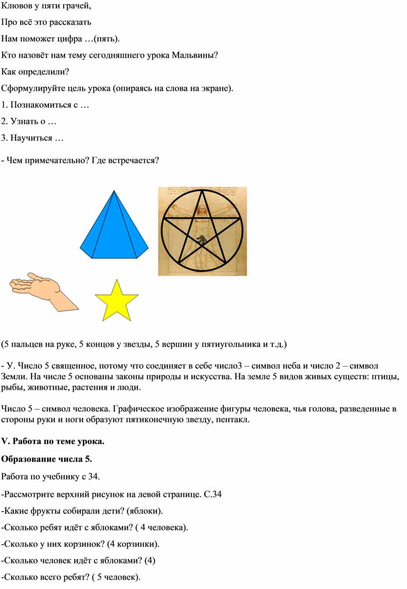 - познакомить с образованием числа 5 и его графической записью-цифрой 5; - научить писать цифру 5; - продолжать подготовительную работу к изучению темы «Задача»; |