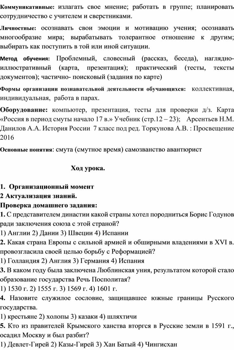 Оборудование: компьютер, презентация, тесты для проверки д/з. Карта «Россия в период смуты начало 17 в.» Учебник (стр.12 – 23); Арсентьев Н.М. Данилов А.А. История России 7 класс под ред. Торкунова А.В. : Просвещение 2016