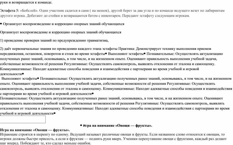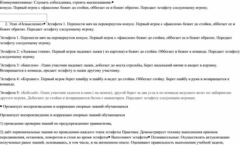 Организует воспроизведение и коррекцию опорных знаний обучающихся 1) проведение проверки знаний по предупреждению травматизма, 2) даёт первоначальные знания по проведению каждого этапа эстафеты Практика: Демонстрирует технику выполнения приемов передвижения, остановок, поворотов и стоек во время эстафеты |