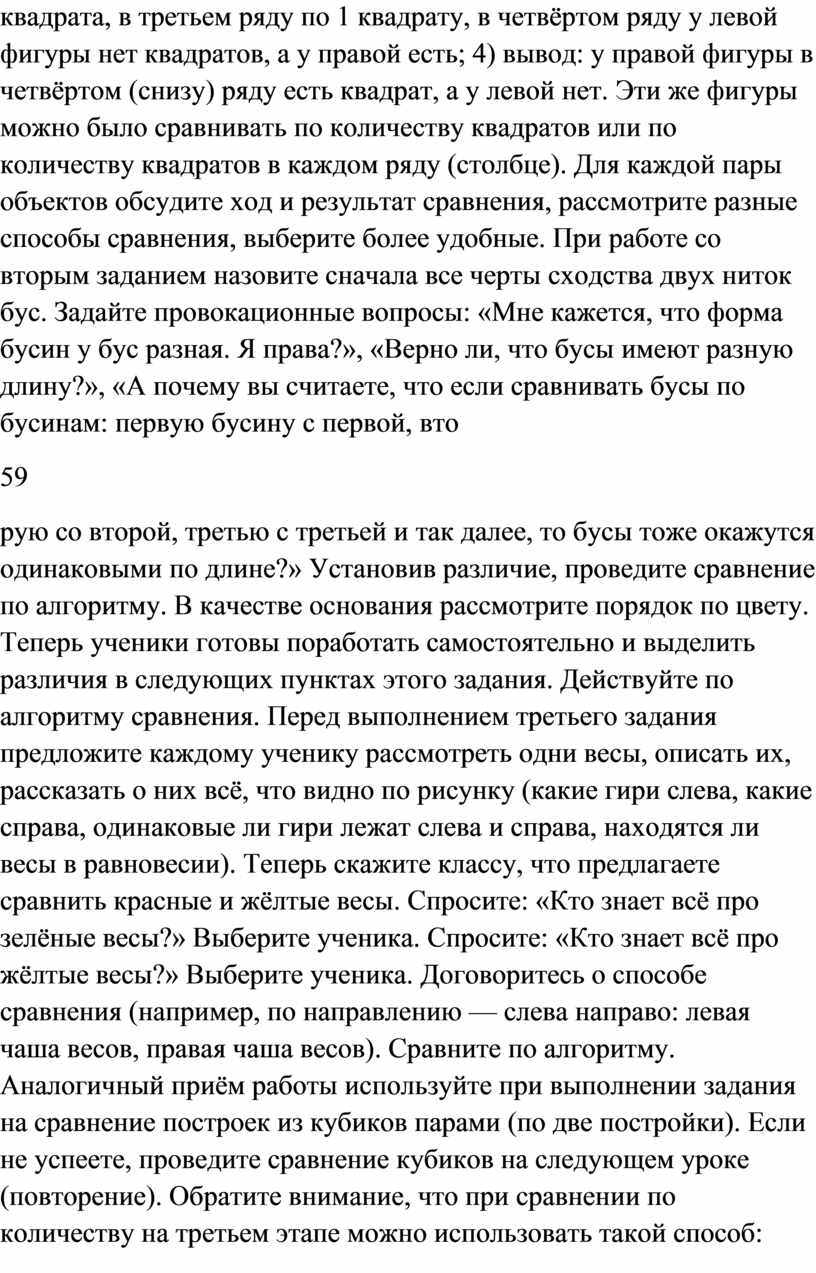 боры предметов по количеству, фигуры по размеру и пр. Для того чтобы действие сравнения в дальнейшем стало универсальным, необходимо уже в 1 классе алгоритмизировать его. Поэтому первокласснику предлагается последовательность действий, которую он будет выполнять каждый раз (сначала под руководством учителя, а потом самостоятельно), когда нужно будет сравнить объекты. Действия при сравнении по одному основанию (алгоритм сравнения): 1) назови (укажи, покажи) то, что будешь сравнивать; 2) назови основание для сравнения, способ сравнения; 3) сравни объекты (используется набор операций, характерный для предметного действия); 4) сделай вывод. В качестве основания для сравнения могут выступать цвет, форма, назначение, наличие или отсутствие признака и т. д. Если речь идёт о способе сравнения, то это может быть сравнение слева направо, сверху вниз и т. п. Если оснований несколько, то по каждому сравнение производится отдельно, каждый раз алгоритм сравнения применяется полностью. Приведём в качестве примера ход сравнения двух первых фигур первого задания: 1) сравниваю две первые фигуры из квадратов — левую и правую; 2) буду сравнивать снизу вверх; 3) у левой и правой фигур в нижнем ряду по 3 квадрата, во втором ряду по 2 квадрата, в третьем ряду по 1 квадрату, в четвёртом ряду у левой фигуры нет квадратов, а у правой есть; 4) вывод: у правой фигуры в четвёртом (снизу) ряду есть квадрат, а у левой нет. Эти же фигуры можно было сравнивать по количеству квадратов или по количеству квадратов в каждом ряду (столбце). Для каждой пары объектов обсудите ход и результат сравнения, рассмотрите разные способы сравнения, выберите более удобные. При работе со вторым заданием назовите сначала все черты сходства двух ниток бус. Задайте провокационные вопросы: «Мне кажется, что форма бусин у бус разная. Я права?», «Верно ли, что бусы имеют разную длину?», «А почему вы считаете, что если сравнивать бусы по бусинам: первую бусину с первой, вто