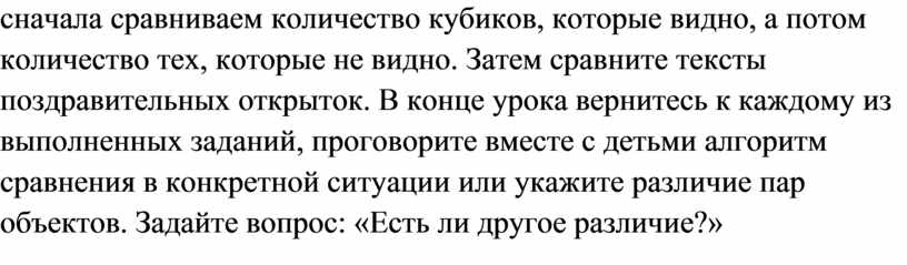 рую со второй, третью с третьей и так далее, то бусы тоже окажутся одинаковыми по длине?» Установив различие, проведите сравнение по алгоритму. В качестве основания рассмотрите порядок по цвету. Теперь ученики готовы поработать самостоятельно и выделить различия в следующих пунктах этого задания. Действуйте по алгоритму сравнения. Перед выполнением третьего задания предложите каждому ученику рассмотреть одни весы, описать их, рассказать о них всё, что видно по рисунку (какие гири слева, какие справа, одинаковые ли гири лежат слева и справа, находятся ли весы в равновесии). Теперь скажите классу, что предлагаете сравнить красные и жёлтые весы. Спросите: «Кто знает всё про зелёные весы?» Выберите ученика. Спросите: «Кто знает всё про жёлтые весы?» Выберите ученика. Договоритесь о способе сравнения (например, по направлению — слева направо: левая чаша весов, правая чаша весов). Сравните по алгоритму. Аналогичный приём работы используйте при выполнении задания на сравнение построек из кубиков парами (по две постройки). Если не успеете, проведите сравнение кубиков на следующем уроке (повторение). Обратите внимание, что при сравнении по количеству на третьем этапе можно использовать такой способ: сначала сравниваем количество кубиков, которые видно, а потом количество тех, которые не видно. Затем сравните тексты поздравительных открыток. В конце урока вернитесь к каждому из выполненных заданий, проговорите вместе с детьми алгоритм сравнения в конкретной ситуации или укажите различие пар объектов. Задайте вопрос: «Есть ли другое различие?»