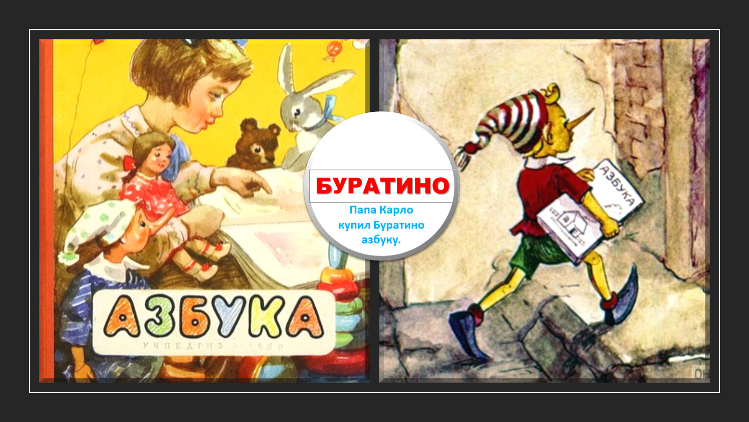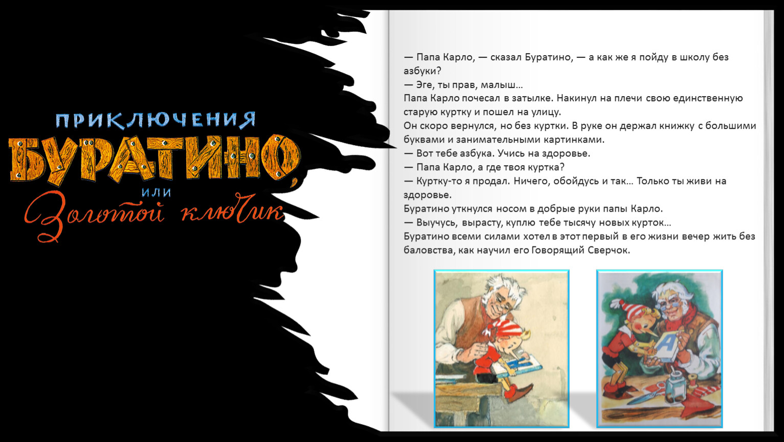 — Папа Карло, — сказал Буратино, — а как же я пойду в школу без азбуки?