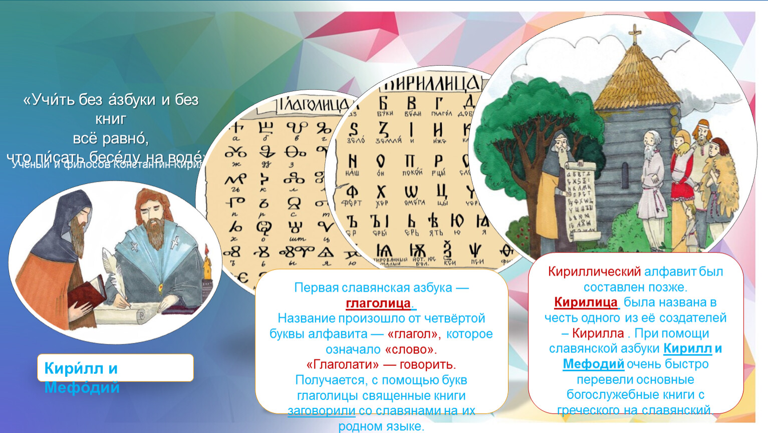 Кирилица была названа в честь одного из её создателей – Кирилла . При помощи славянской азбуки Кирилл и Мефодий очень быстро перевели основные богослужебные книги с греческого на славянский.