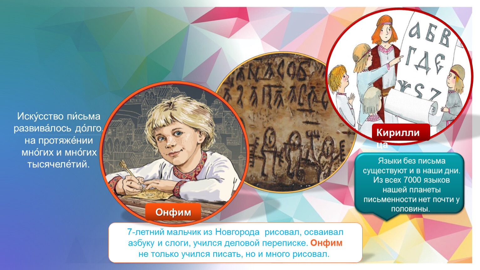 7-летний мальчик из Новгорода рисовал, осваивал азбуку и слоги, учился деловой переписке. Онфим не только учился писать, но и много рисовал.