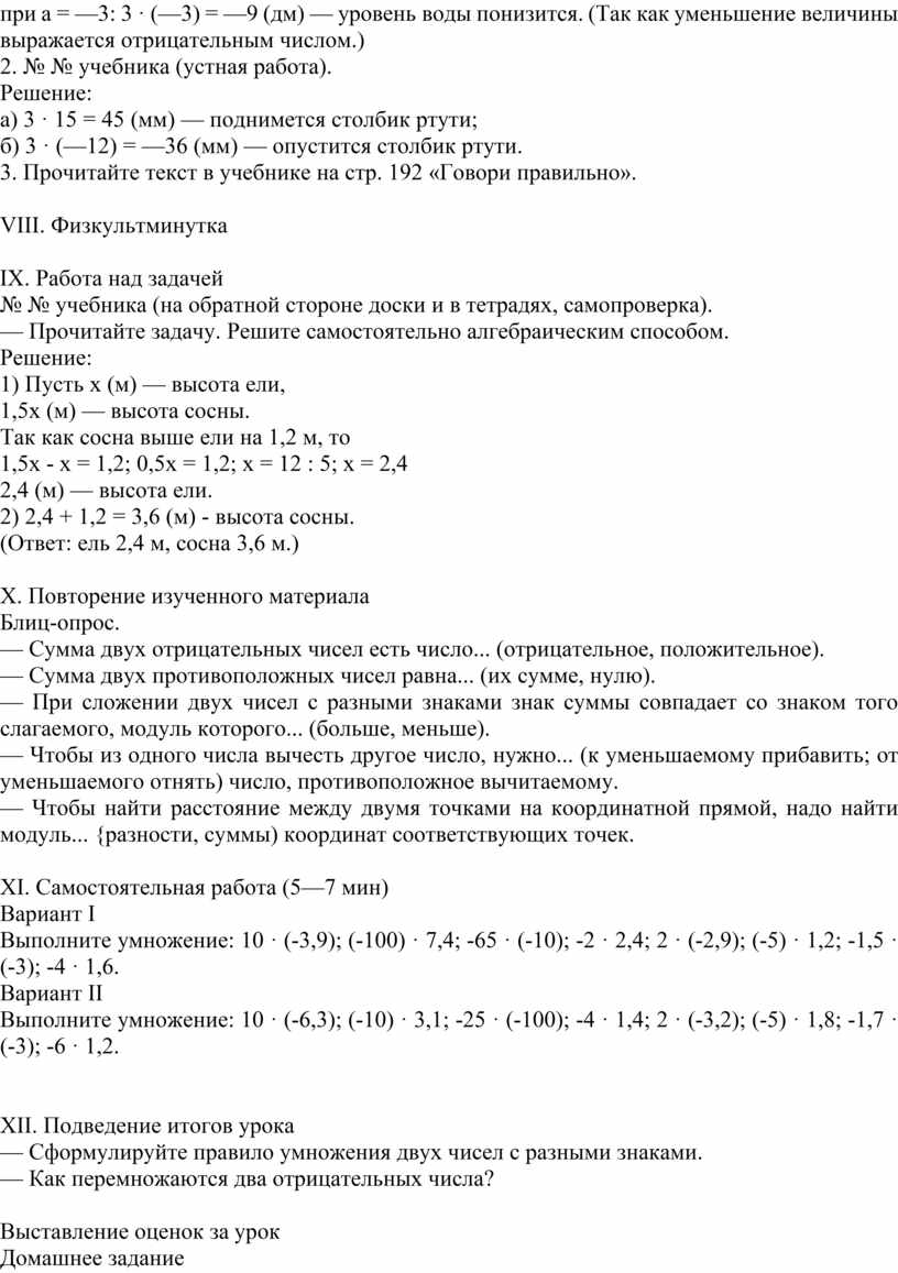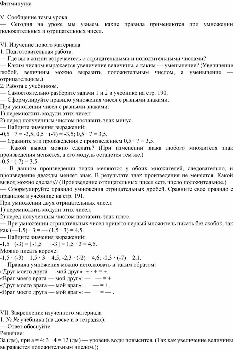 Урок «Умножение положительных и отрицательных чисел», 6 кл
