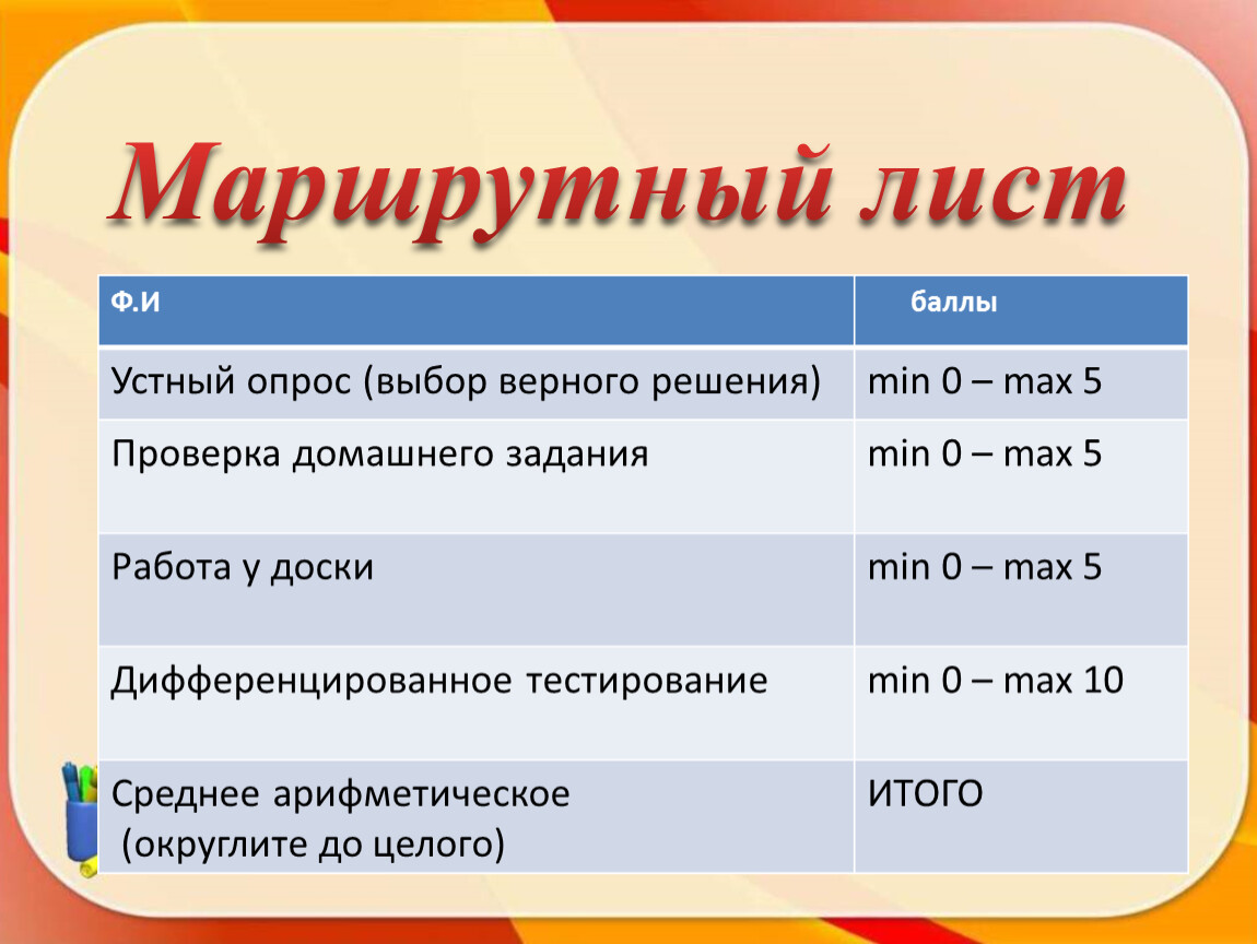 Устный опрос (выбор верного решения) | min 0 – max 5 |