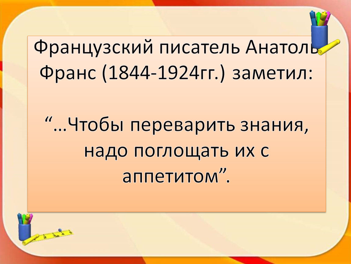 Французский писатель Анатоль Франс (1844-1924гг.) заметил: “…Чтобы переварить знания, надо поглощать их с аппетитом”.