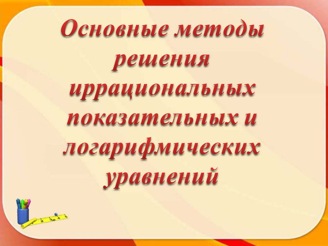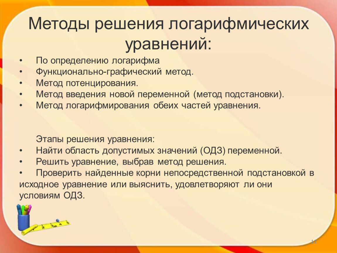Методы решения логарифмических уравнений: