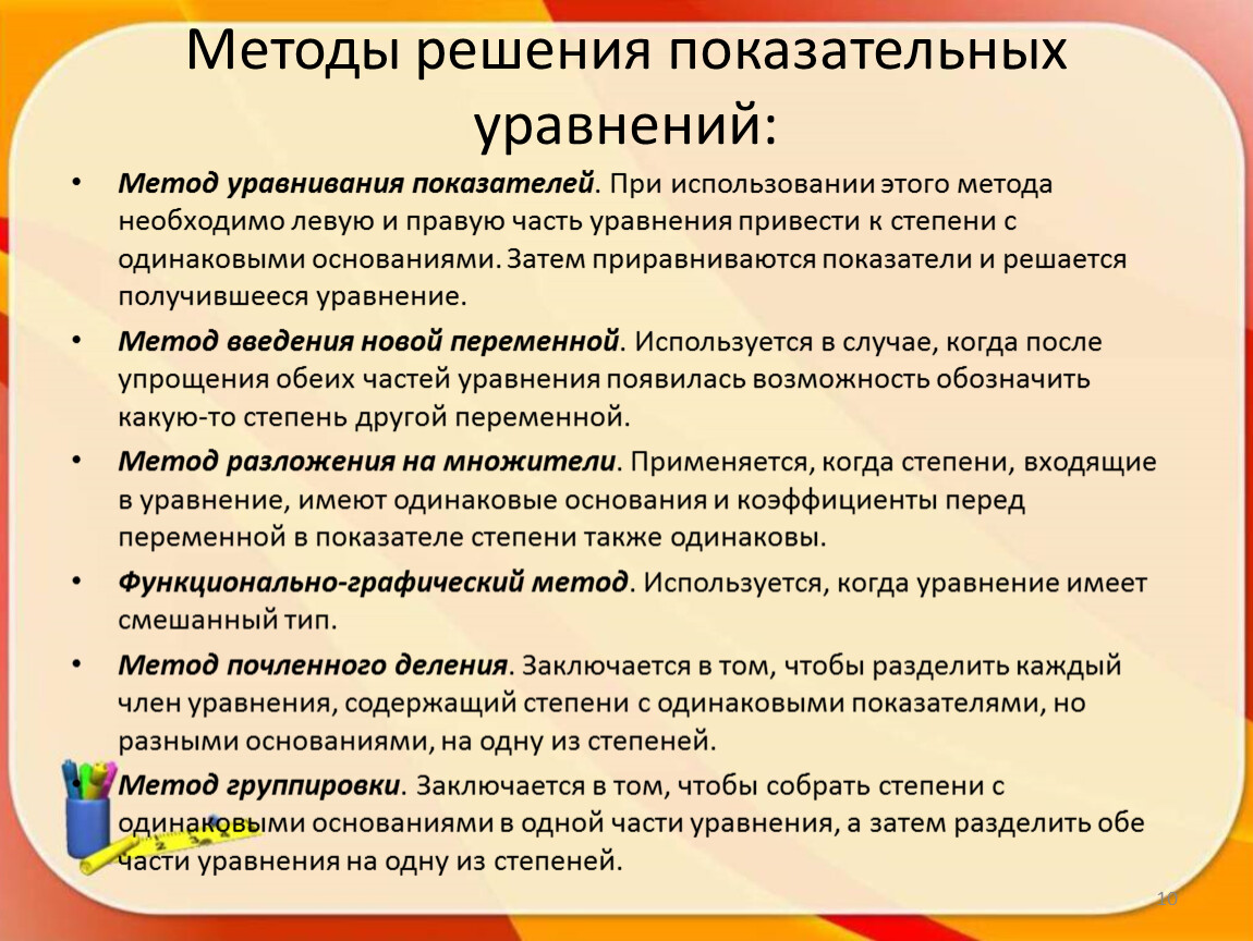 Методы решения показательных уравнений: