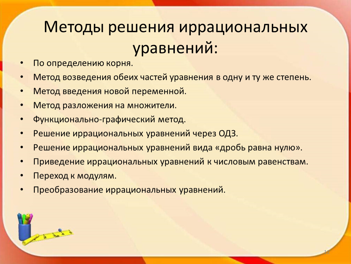 Методы решения иррациональных уравнений: