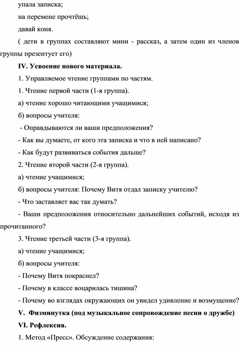 б) вопросы учителя: Почему Витя отдал записку учителю?