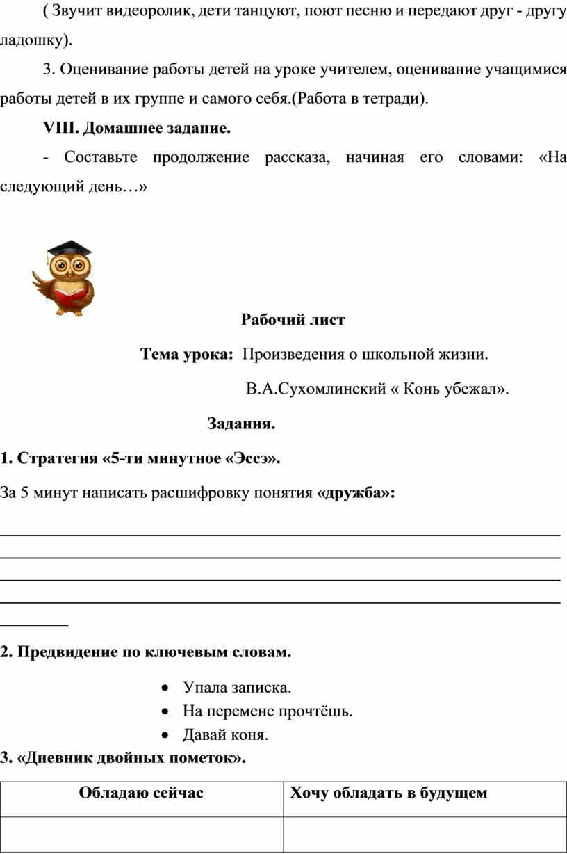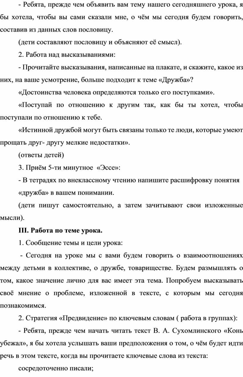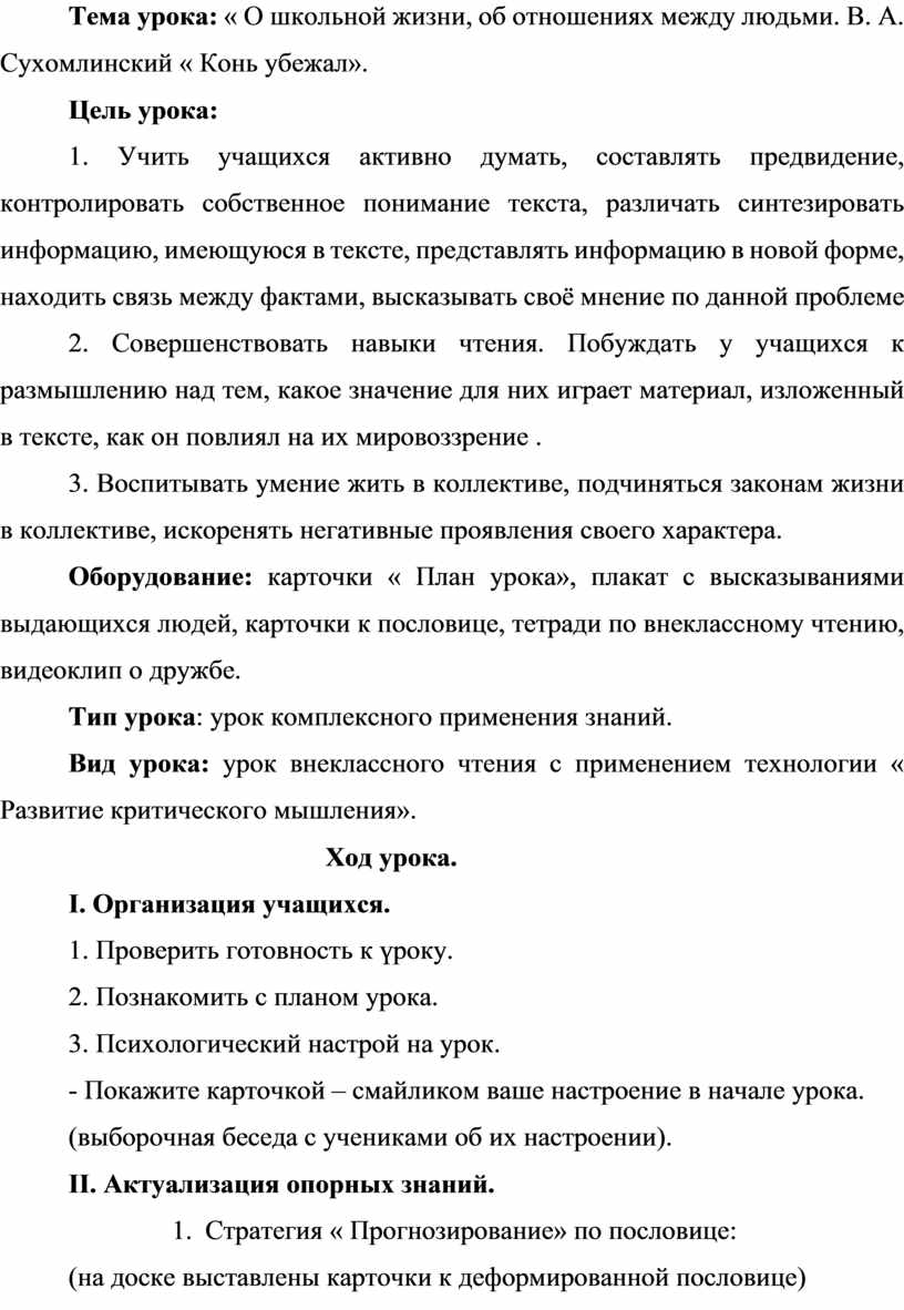 Тема урока: « О школьной жизни, об отношениях между людьми. B. А. Сухомлинский « Конь убежал».