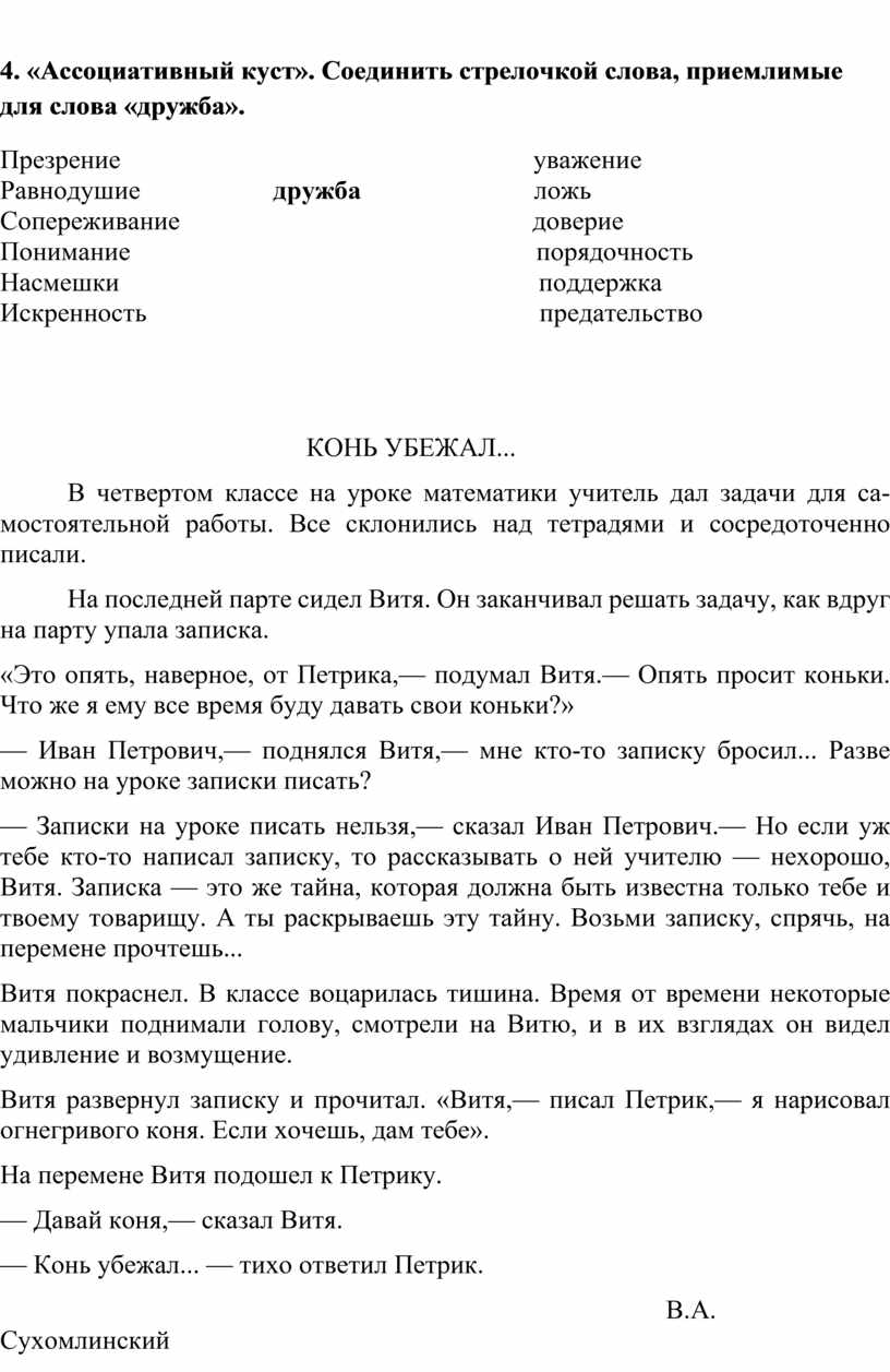 4. «Ассоциативный куст». Соединить стрелочкой слова, приемлимые для слова «дружба».