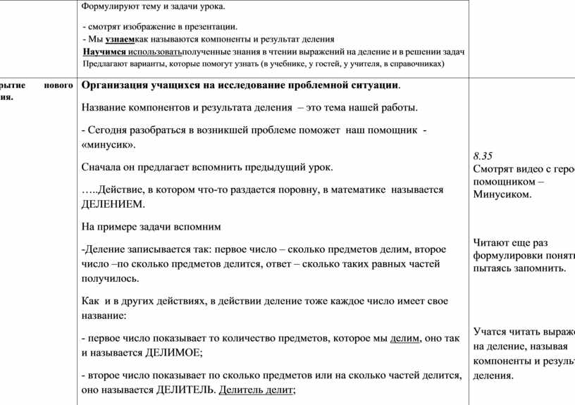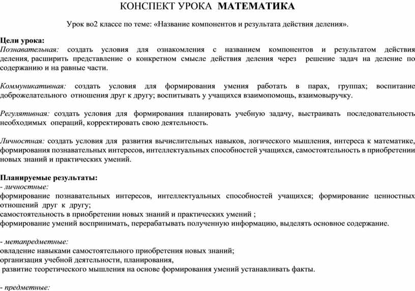Урок во2 классе по теме: «Название компонентов и результата действия деления».