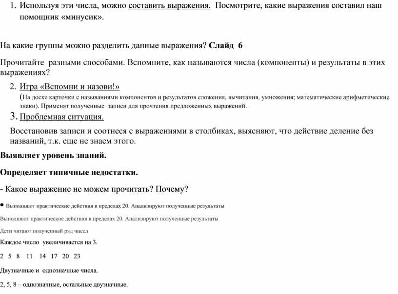 Выполняют практические действия в пределах 20. Анализируют полученные результаты Дети читают полученный ряд чисел Каждое число увеличивается на 3. 2 5 8 11 14 17 20 23 Двузначные и однозначные числа. 2, 5, 8 – однозначные, остальные двузначные. Чётные и нечётные. 2, 8, 14, 20 – чётные, 5, 11, 17, 23 – нечётные. 8+2 5х2 2х5 20:2 20-11 14-5 11-2 17-8 2х8 8х2 11+5
