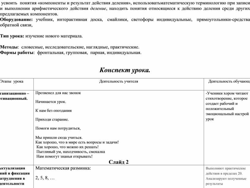 усвоить понятия «компоненты и результат действия деления», использоватьматематическую терминологию при записи и выполнении арифметического действия деление, находить понятия относящиеся к действию деления среди других предлагаемых компонентов.