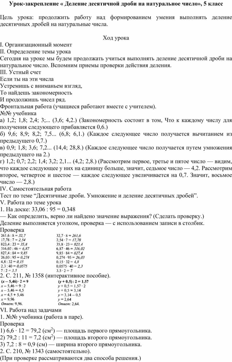 Урок-закрепление « Деление десятичной дроби на натуральное число», 5 класс