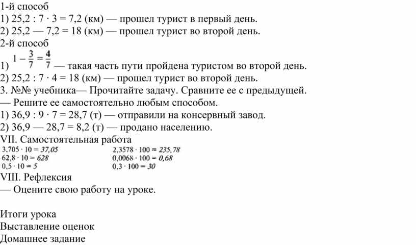 1) 25,2 : 7 ∙ 3 = 7,2 (км) — прошел турист в первый день.
