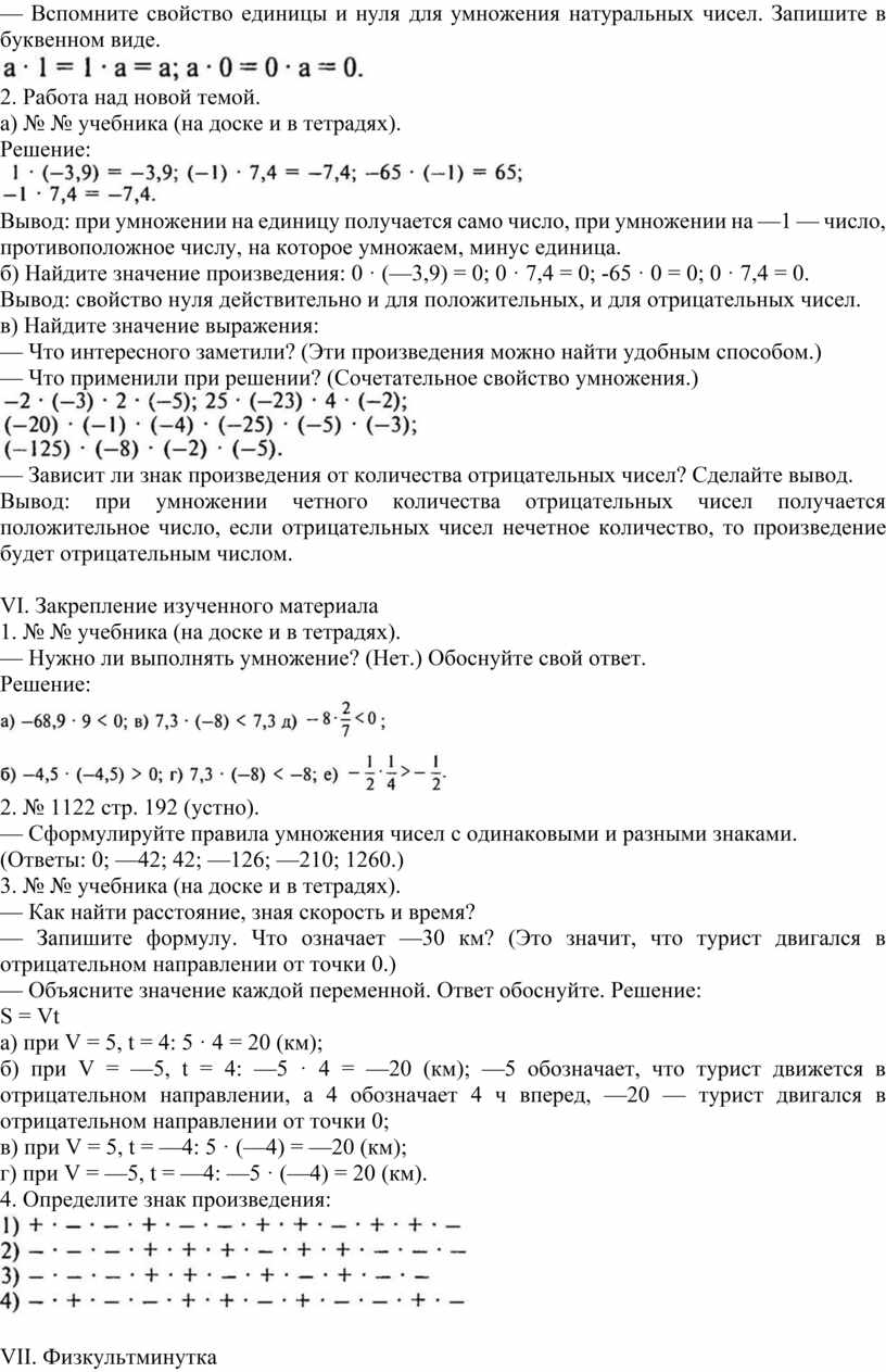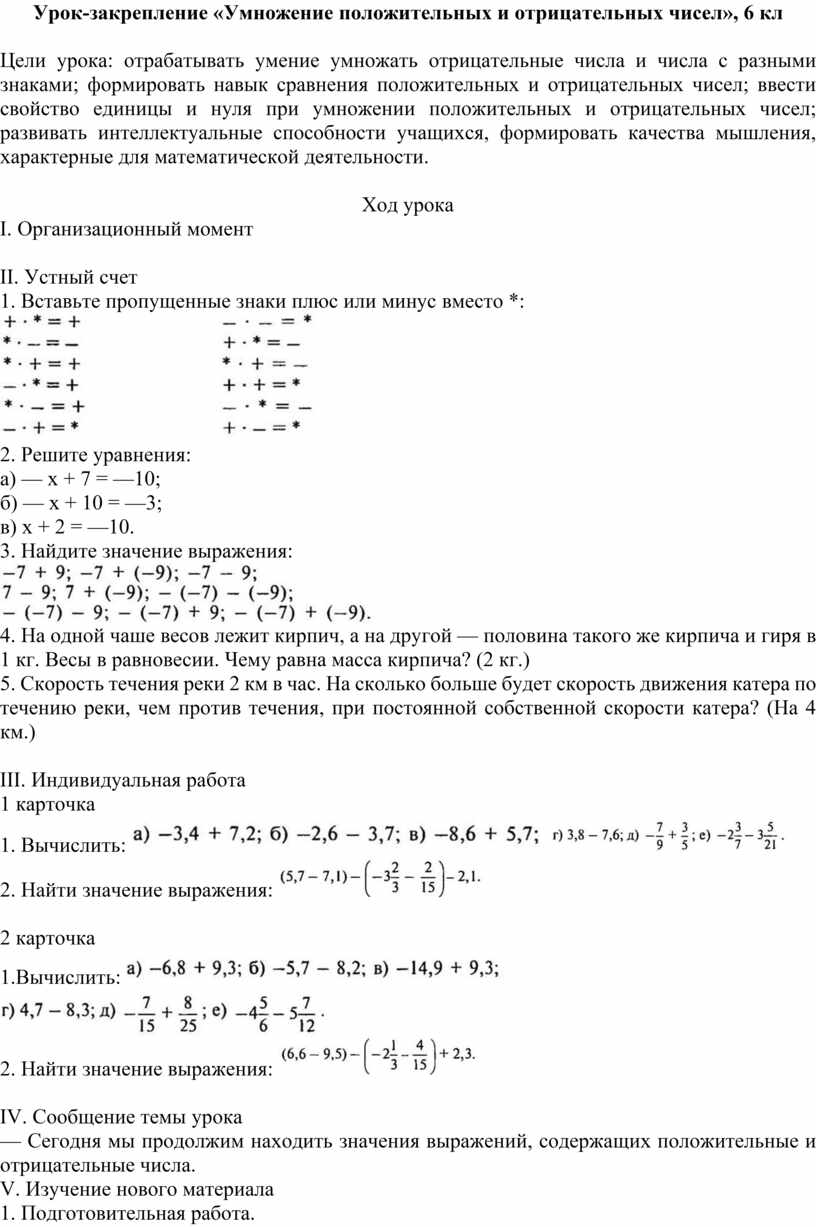 Урок-закрепление «Умножение положительных и отрицательных чисел», 6 кл