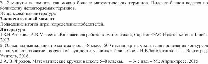 За 2 минуты вспомнить как можно больше математических терминов. Подсчет баллов ведется по количеству неповторяемых терминов.