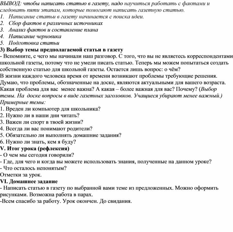 ВЫВОД: чтобы написать статью в газету, надо научиться работать с фактами и следовать пяти этапам, которые помогают написать газетную статью.