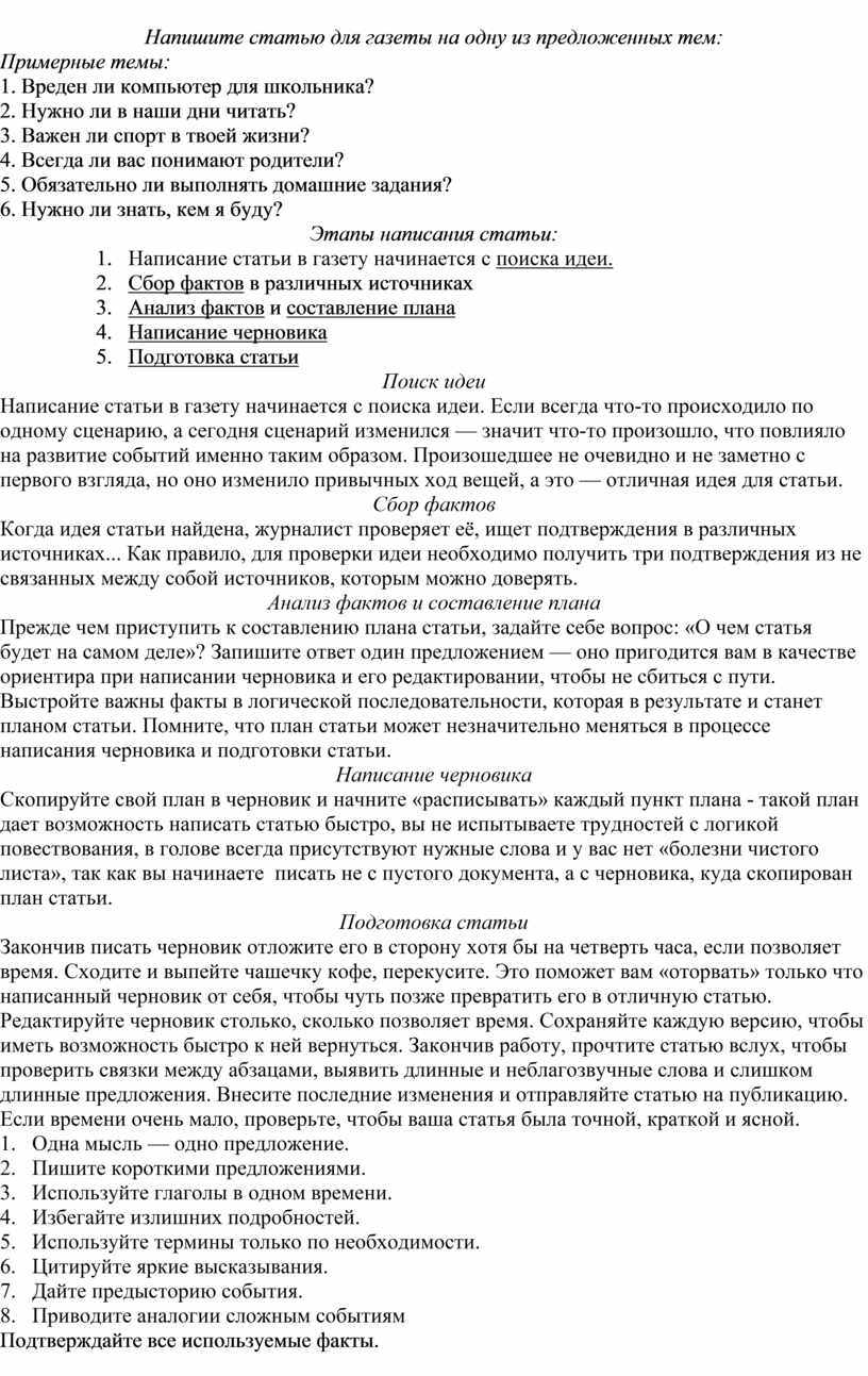- Написать статью в газету по выбранной вами теме из предложенных. Можно оформить рисунками. Возможна работа в парах.