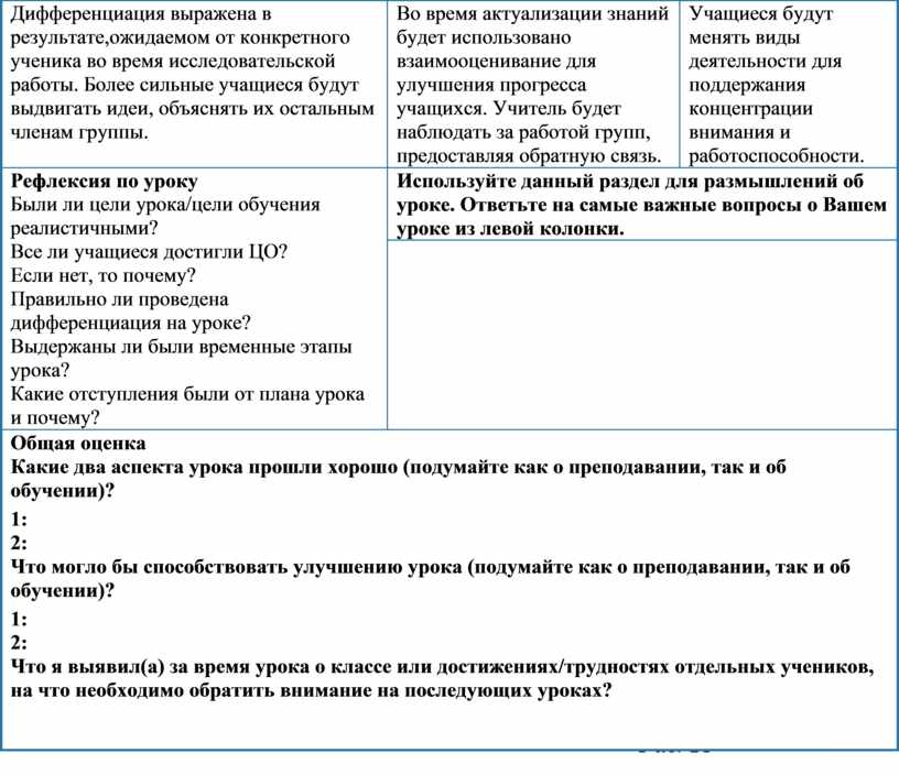 Общая оценка Какие два аспекта урока прошли хорошо (подумайте как о преподавании, так и об обучении)? 1: 2: Что могло бы способствовать улучшению урока (подумайте как о преподавании, так и об обучении)? 1: 2: Что я выявил(а) за время урока о классе или достижениях/трудностях отдельных учеников, на что необходимо обратить внимание на последующих уроках?